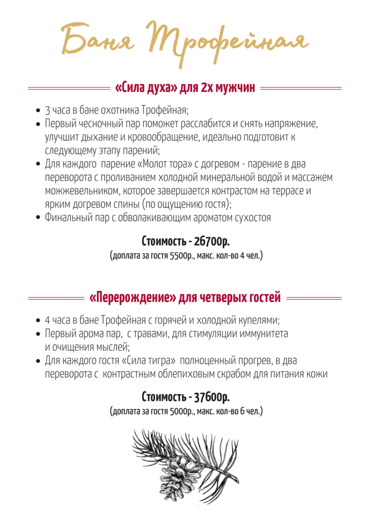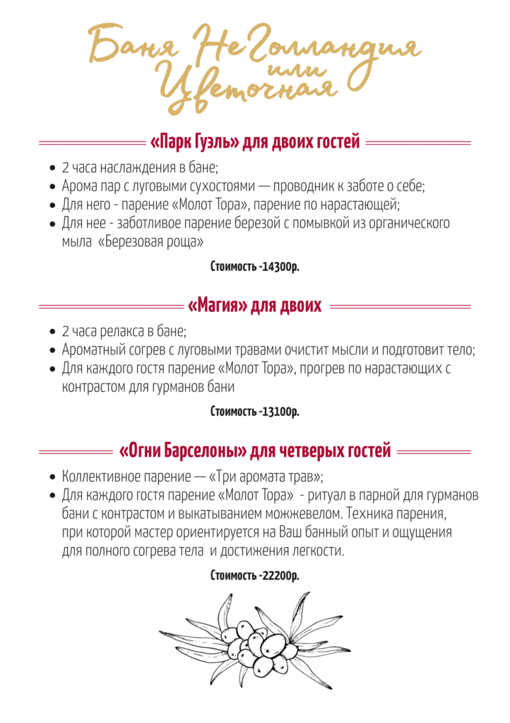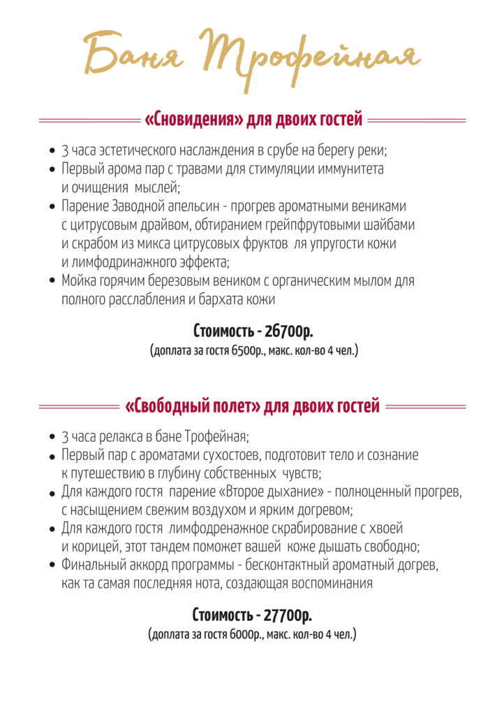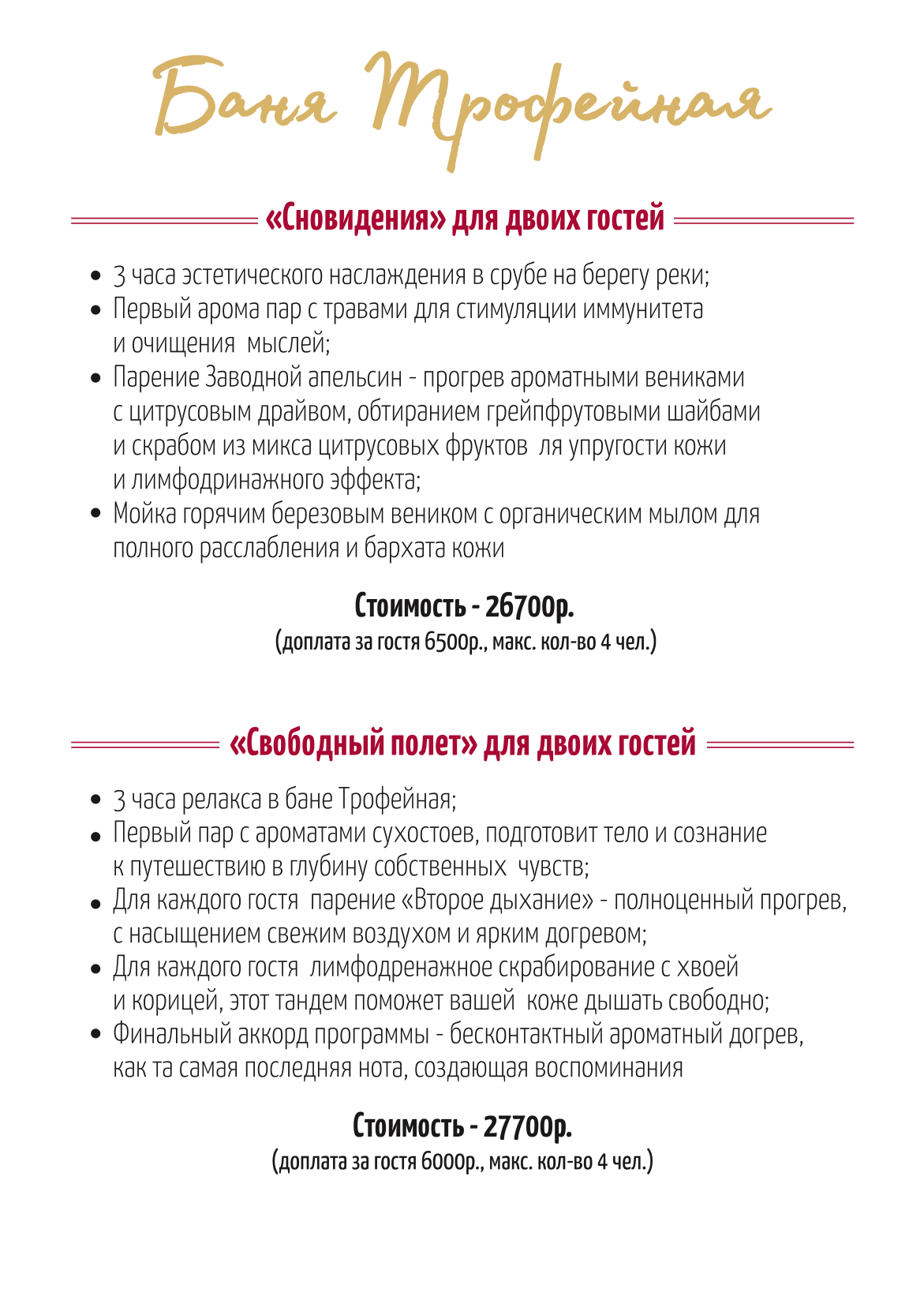 Если вы собираетесь большой компанией - то этот уютный 3-х этажный дом с березовой русской парной по-белому (в печи камень жадеит) и прохладным бассейном на первом этаже, просторной зоной отдыха и чайным столом на втором, массажным кабинетом на третьем для вас На Комплексе доступны так же процедуры по уходу за телом – чистки, мойки, обертывания.
