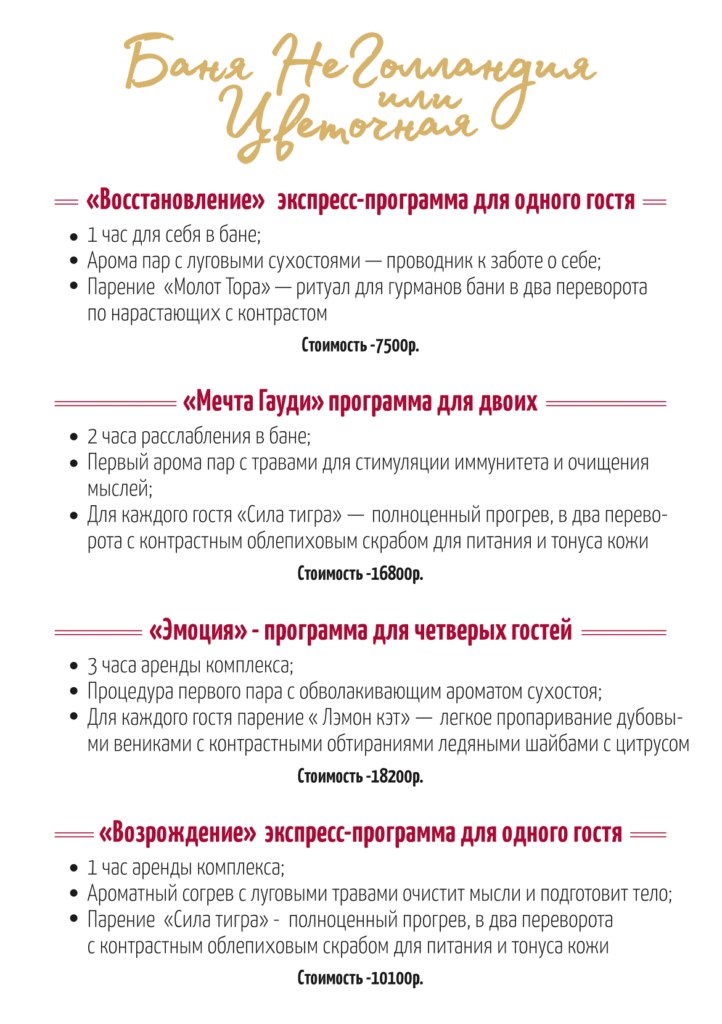 Хочется насладиться ароматами цветов и трав ? Вам точно понравится "Цветочная баня". Каменный дом внутри украшен деревом м сухостоем. Перед парением банщики проводят процедуру знакомства с паром - аромапарение. Парная наполняется ароматом трав и эфирных масел.